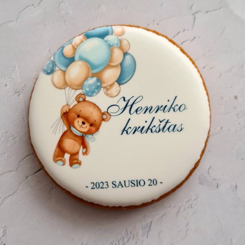 Dekoruoto meduolinio sausainio diametras 7,5-8 cm. Kaina už 1 vnt. Kiekvienas sausainis atskirai supakuojamas į skaidrų maišelį su lipnia juostele.