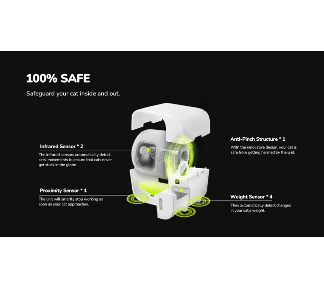 Mūsų pagrindinis rūpestis yra jūsų katės saugumas, todėl įdiegėme gelbėjimo sistemą, kurią sudaro iš viso 7 saugos jutikliai ir apsauga nuo suspaudimo. Nesvarbu, ar jūsų katė yra kraiko dėžėje, ar šalia, ši išmanioji kačių kraiko dėžė gali aptikti jos buvimą ir užblokuos dureles, taip užtikrindama, kad jūsų katė nebus sužalota. Svarbu: kad galėtumėte naudoti automatinio valymo funkciją, jūsų katė turi sverti bent 3 svarus. Jei turite mažą kačiuką, išjunkite automatinio valymo funkciją, kol jis pasieks minimalų svorį.