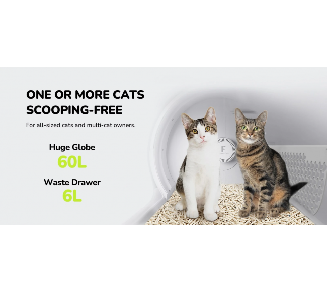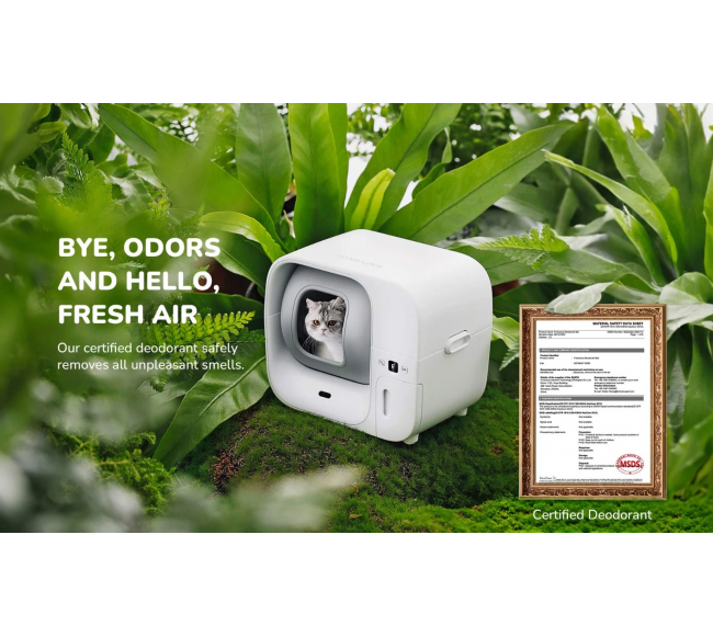 Šioje erdvioje 60 l talpos kačių kraiko dėžutėje be vargo telpa daugiau nei viena katė, tenkinant namų ūkių, kuriuose yra daug kačių draugų, poreikius. Be to, gausus 6 l atliekų stalčius kartu su sertifikuotu kvapų šalinimo dezodorantu leidžia net 3 mėnesius be vargo skalbti.