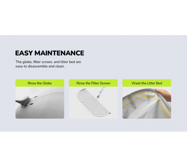 Unikalios formos filtro tinklelis veikia kaip automatinis koštuvas, skirtas visoms sulipusiems kraikams, išfiltruojant kačių atliekas ir paliekant šviežią kraiką kitam naudojimui. Norėdami išvalyti kačių kraiko dėžutę, atlikite tik kelis paprastus veiksmus, kad nuimtumėte gaublį, filtro ekraną ir kraiko lovą, kad galėtumėte išvalyti. Tai nepaprastai patogu. Visiškai automatizuota sąranka ir dezodoranto sprendimas taip pat padeda sumažinti reikiamo valymo dažnumą ir sutaupyti brangaus laiko, energijos ir pinigų.