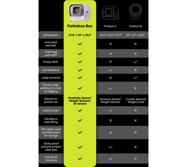 Skirtingai nuo kitų kačių kraiko dėžių, kuriose naminių gyvūnėlių savininkai turi rankiniu būdu semti kačių atliekas, ši kačių kraiko dėžutė atlieka visas procedūras automatiškai, įskaitant automatinį valymą, pakavimą ir plastikinio maišelio sandarinimą. Reikia garbės būti pirmąja tikrai automatine kačių kraiko dėžute rinkoje.
