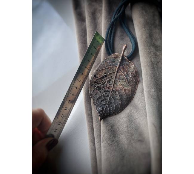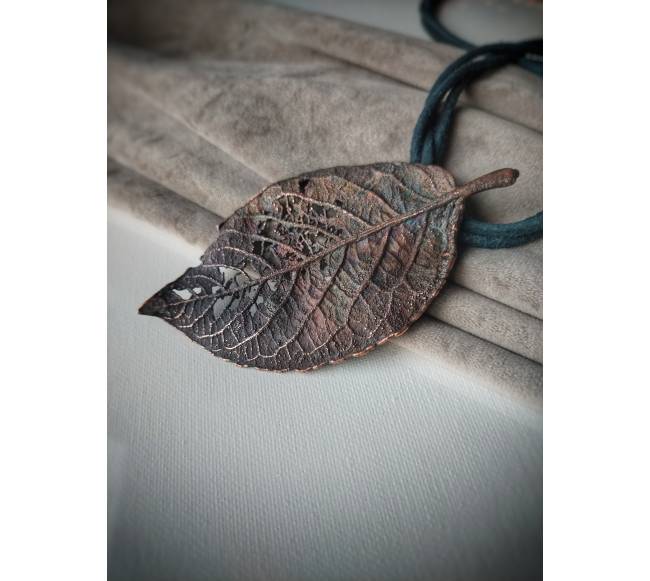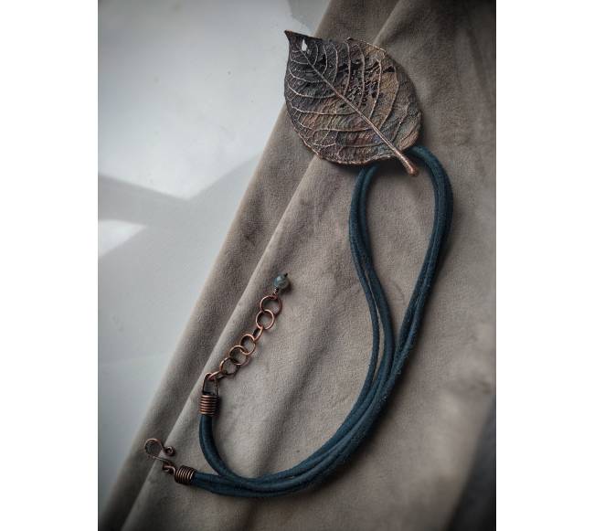 Tikras ievos lapelis, varis (dvipusis padengimas elektroformavimo būdu), juodoji bei autorinė patinos, natūralios verstos odos virvelės, rankų darbo furnitūra, natūralus akmuo - labradoritas, lakas (papuošalo nugarėlė)