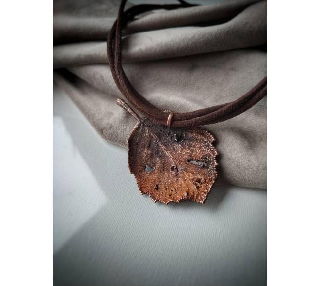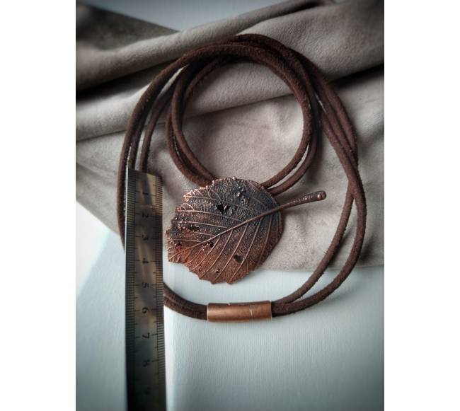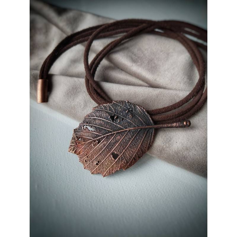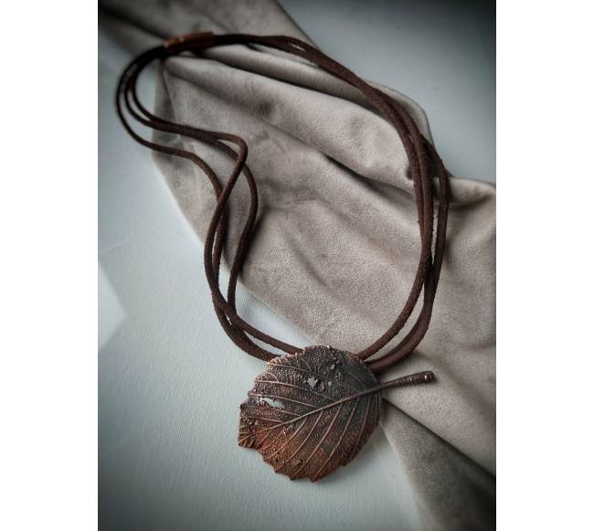 Tikras alksnio lapelis, varis (dvipusis padengimas elektroformavimo būdu), juodoji patina, natūralios verstos odos virvelės, lakas (lapelio nugarėlė), patikimas magnetinis užsegimas