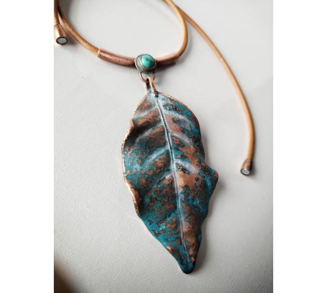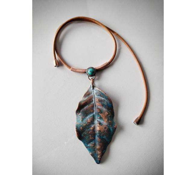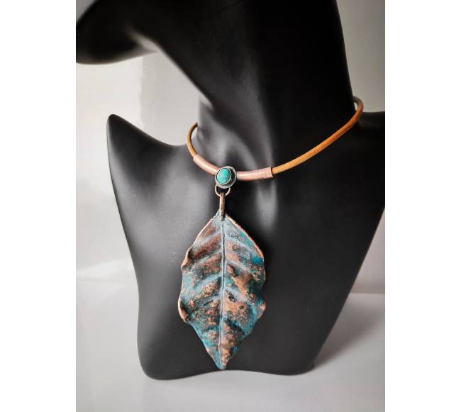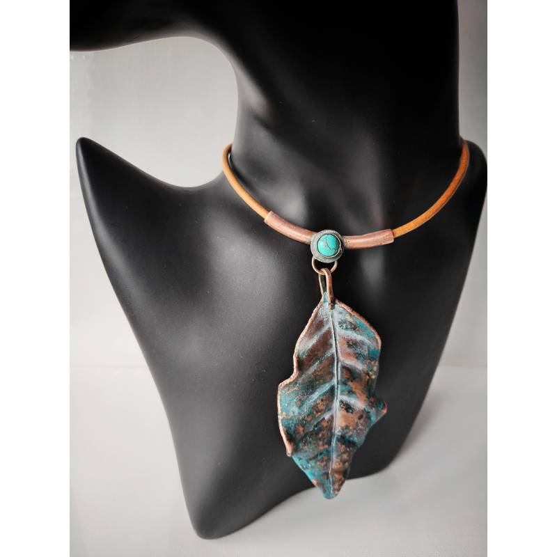Tikras kavamedžio lapelis, varis (vienpusis padengimas), juodoji bei malachito patinos, natūralios odos virvelė, magnetinis uzsegimas, natūralus akmuo turkis