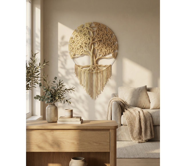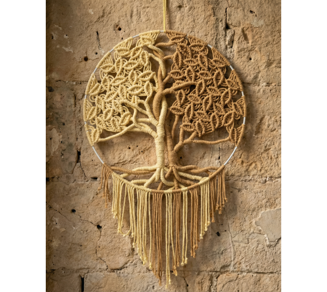 Makrame būdu nupinta "Gyvybės medžio" sienos dekoracija – tai elegantiškas rankų darbo kurinys, simbolizuojantis gyvenimo ciklą, jungtį tarp dangaus ir žemės, šviesos ir tamsos, praeities, dabarties ir ateities.