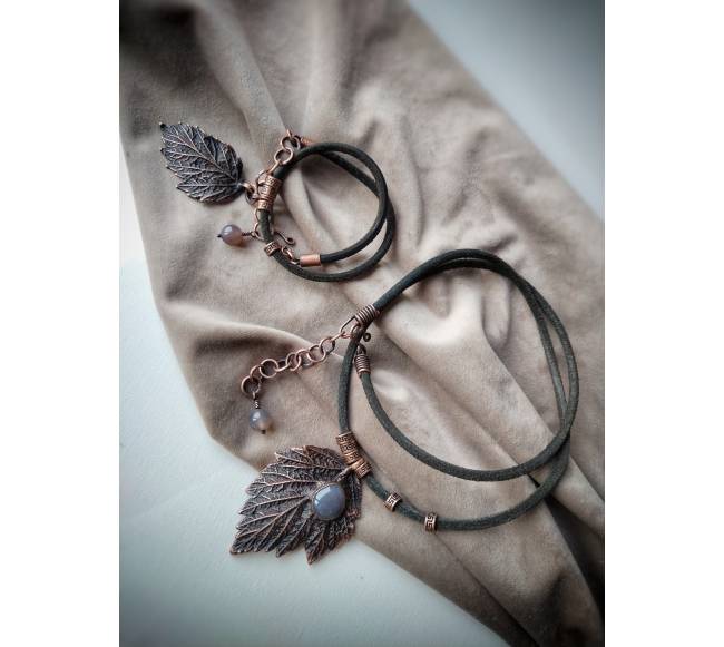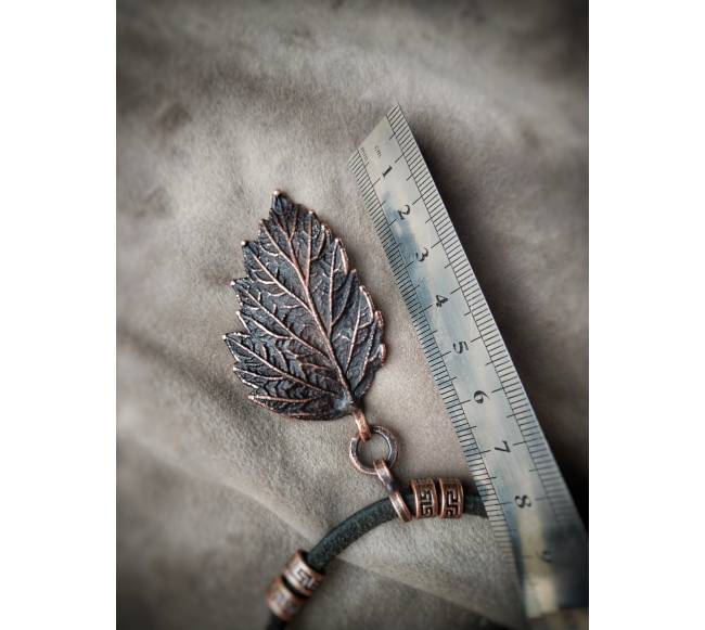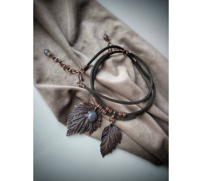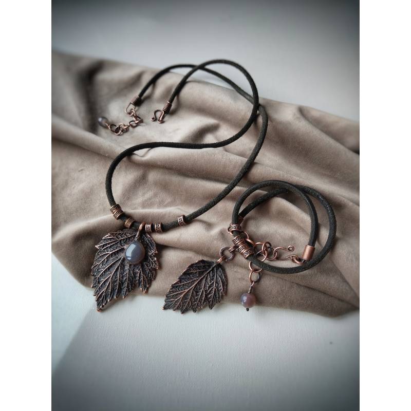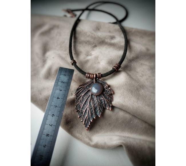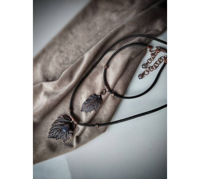 Tikri avietės lapeliai, varis (dvipusis padengimas elektroformavimo būdu), juodoji patina, natūralios verstos odos virvelės, natūralūs akmenys - dūminis agatas, rankų darbo furnitūra, lakas