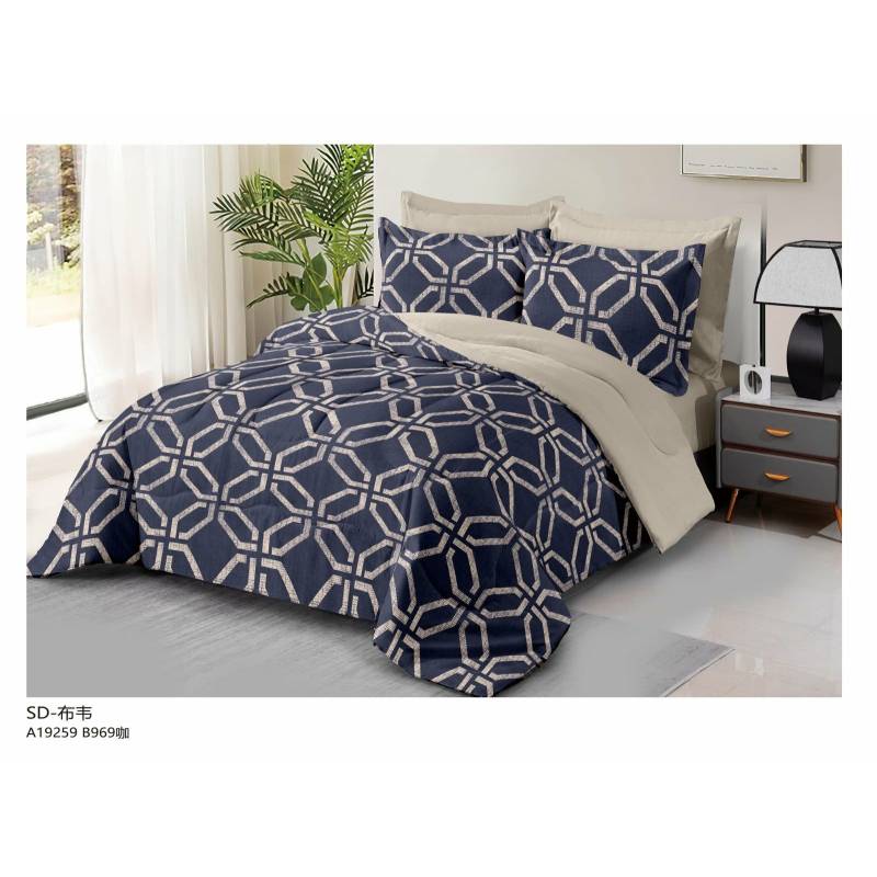 Įneškite šiuolaikinio stiliaus į savo miegamąjį su šiuo elegantišku ir patogiu patalynės komplektu. Ryškus, susipynusių geometrinių figūrų raštas tamsiai mėlyname fone sukuria modernią ir rafinuotą atmosferą. Komplektas yra dvipusis: kita pusė yra rami, šviesiai smėlio spalvos, leidžianti lengvai keisti interjero nuotaiką.