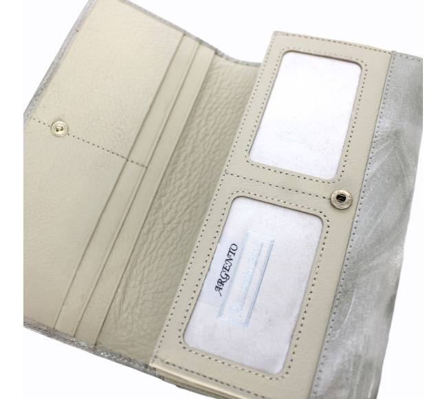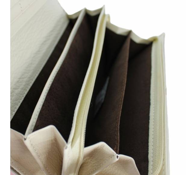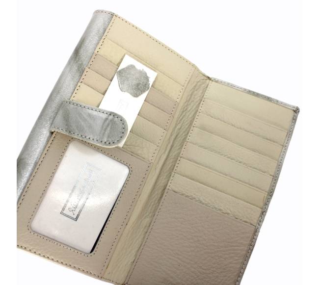 Piniginė klasikinio modelio, erdvi bei talpi. Užsegama spaude, monetoms skirti skyriai užsegami užtrauktuku. Piniginės paviršius blizgus.