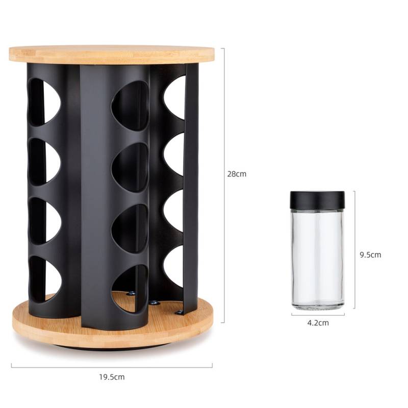 Besisukantis prieskonių stovas su 16 stikliniais indeliais yra funkcionalus ir elegantiškas sprendimas, leidžiantis turėti mėgstamus prieskonius visada po ranka ir suteikiantis tvarkos virtuvės stalviršiui.